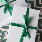 Glossy white gift box tied with green ribbon.